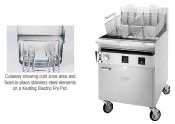 35.7 KW input for cooking up to 200 lbs of frozen French fries per hour - Stainless steel cabinet standard - Instant recovery for high production - Melt Cycle Standard - Stainless steel fryer vessel with mirror finish - Extra large cold zone - Cooks at lower temperatures - Indicating lights and timers - 46"H x 37"D x 25"W